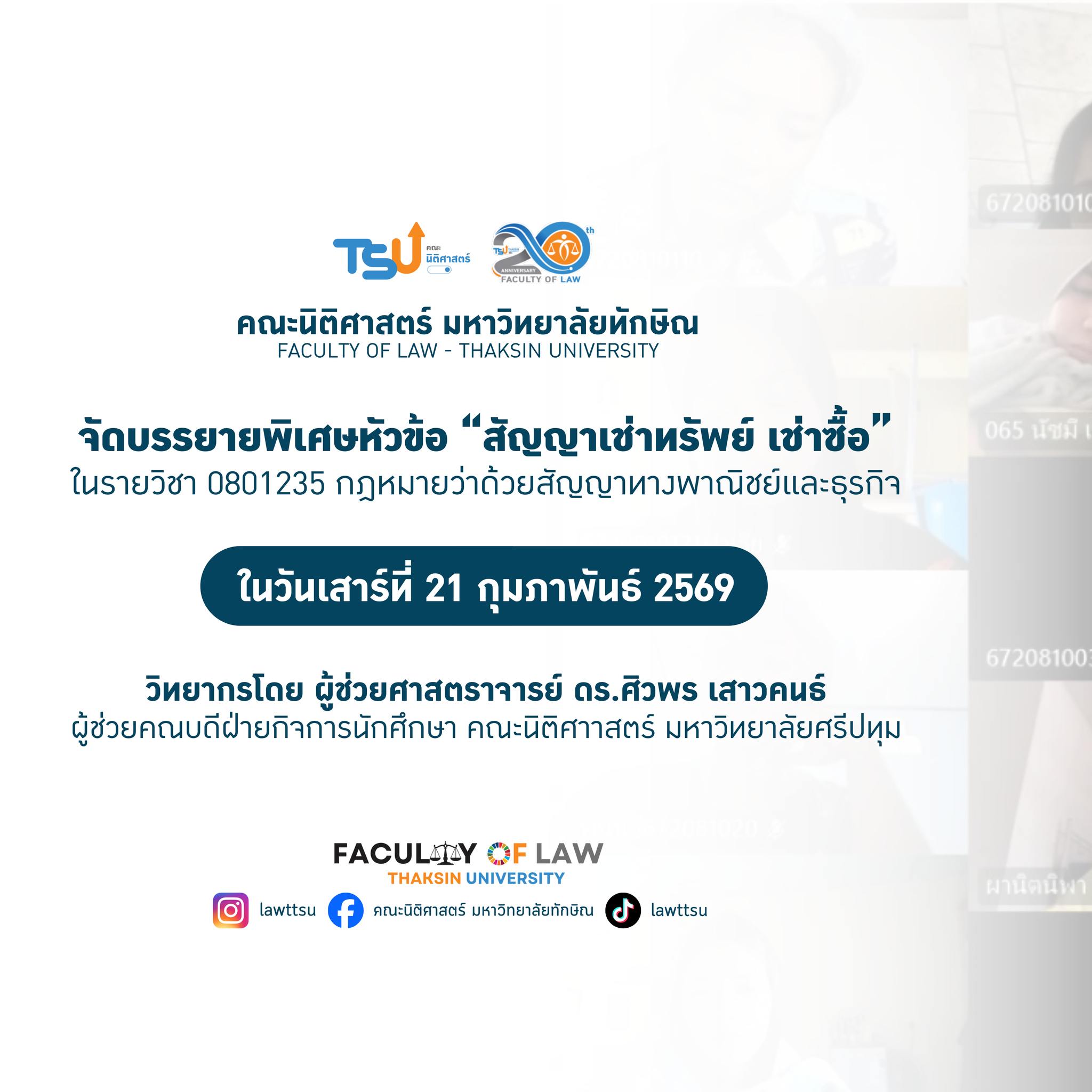 #LawTSU #คณะนิติศาสตร์ #มหาวิทยาลัยทักษิณ #กฎหมายธุรกิจ #เช่าทรัพย์เช่าซื้อ #TSULawพัทลุง #นิติศาสตร์พัทลุง #เรียนกฎหมาย