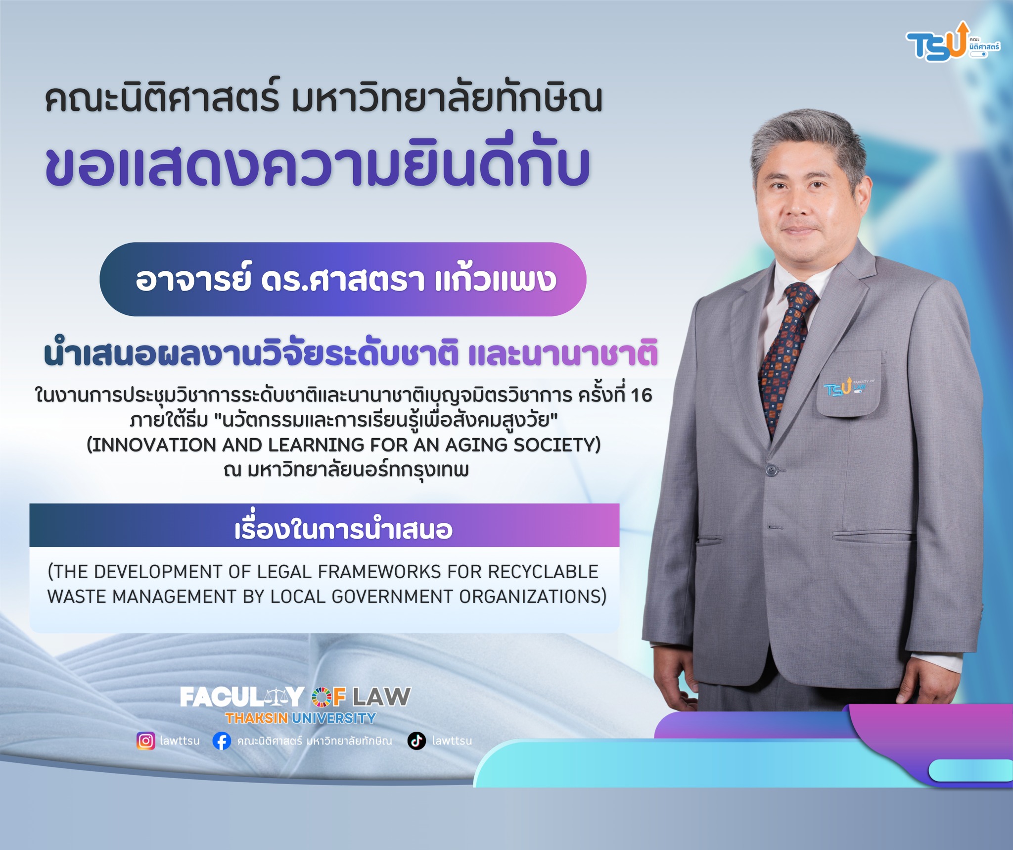 คณะนิติศาสตร์ มหาวิทยาลัยทักษิณ ขอแสดงความชื่นชมและร่วมยินดีกับ อาจารย์ ดร.ศาสตรา แก้วแพง อาจารย์ประจำคณะนิติศาสตร์ ในโอกาสได้รับเกียรติบัตรการนำเสนอผลงานวิจัยระดับชาติและนานาชาติ เรื่อง "The Development of Legal Frameworks for Recyclable Waste Management by Local Government Organizations" ในงานการประชุมวิชาการระดับชาติและนานาชาติเบญจมิตรวิชาการ ครั้งที่ 16 (The 16th Benjamit Vichakarn) ณ มหาวิทยาลัยนอร์ทกรุงเทพ เมื่อวันที่ 27 มีนาคม 2569 ที่ผ่านมา