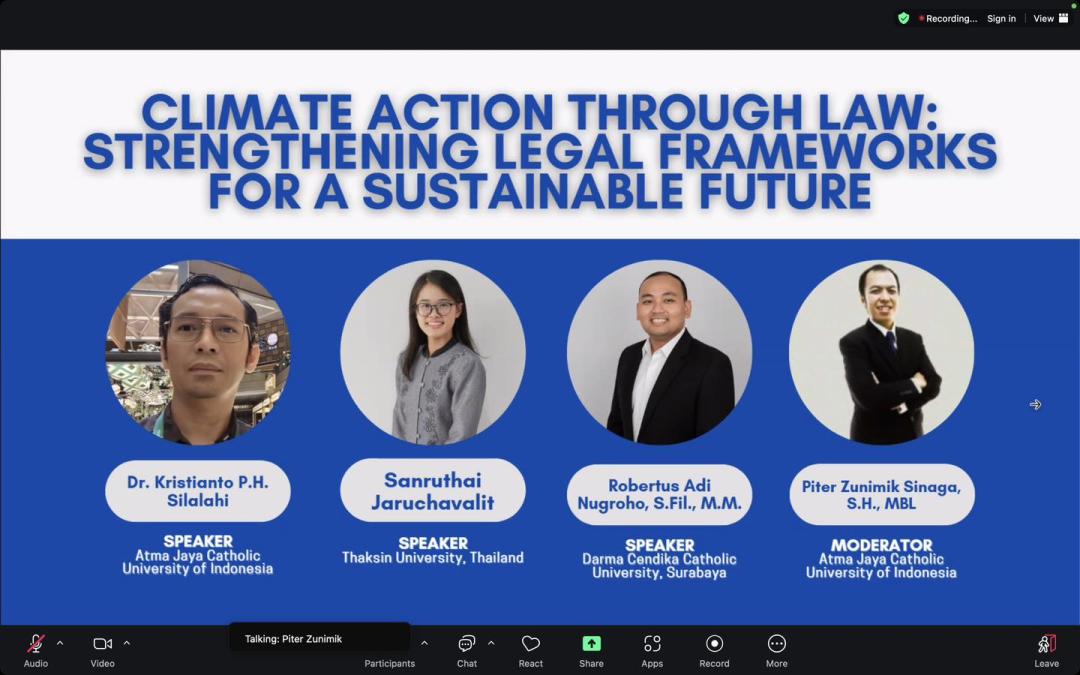 The Faculty of Law at Thaksin University (TSU) is engaged in an international seminar titled "Climate Action through Law: Strengthening Legal Frameworks for a Sustainable Future." This seminar is a collaborative endeavor among regional academic institutions, hosted by Atma Jaya Catholic University, Indonesia. Its primary objective is to explore and discuss the role of legal instruments in addressing the multifaceted challenges posed by global climate change. Thaksin University is represented by Lecturer Sanrutai Jaruchawalit, who is a prominent speaker at this event. Other notable contributors include Dr. Kristanto P.H. Silalahi from Atma Jaya Catholic University of Indonesia and Robertus Adi Nugraho, S.Fil., M.M. from Darma Cendika Catholic University. This participation exemplifies the Faculty of Law's dedication to enhancing legal acumen and contributing to international efforts aimed at mitigating pressing environmental and sustainability issues through the development and implementation of comprehensive legal frameworks.