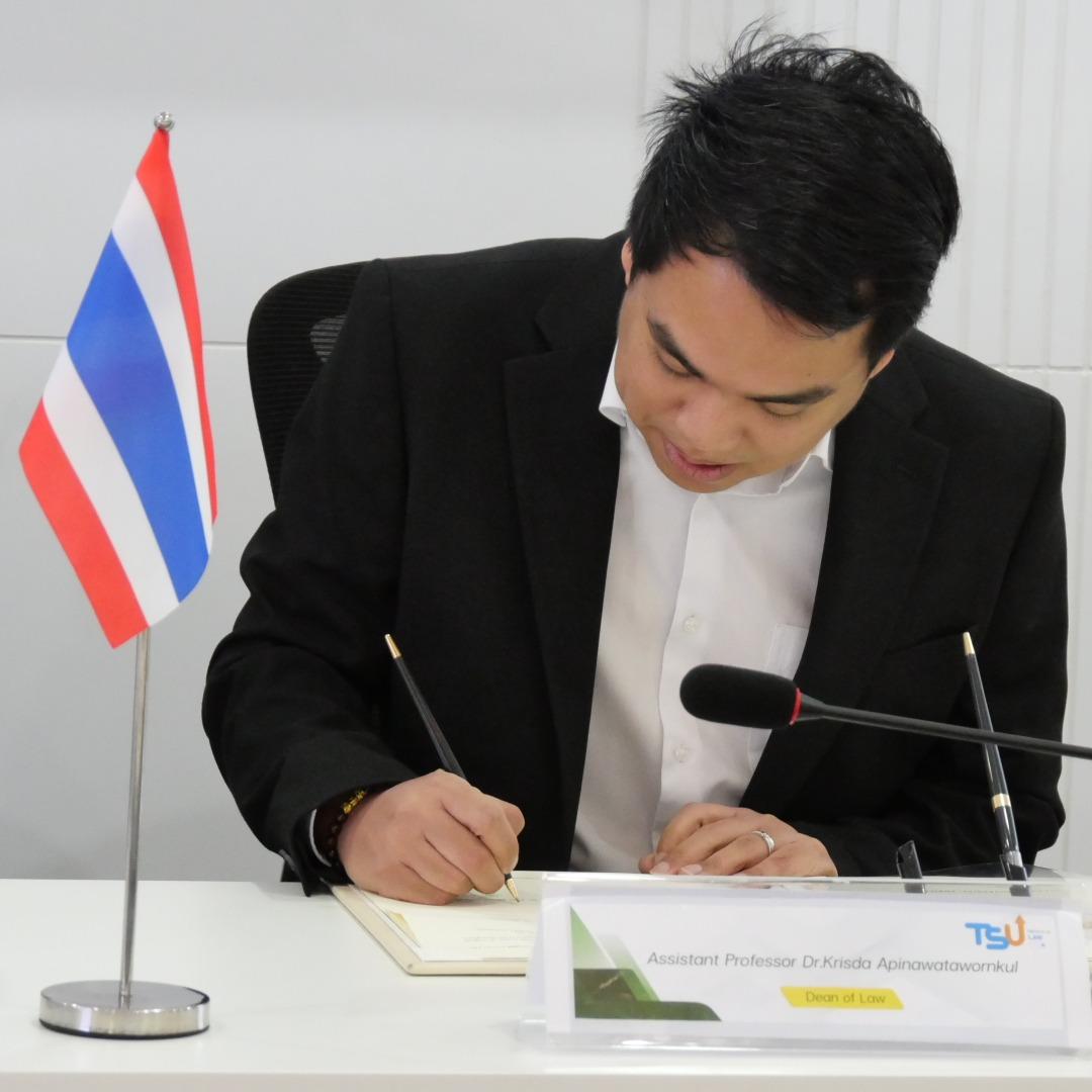 ✨ The Faculty of Law, Thaksin University, has marked a historic milestone! Assistant Professor Dr. Kritsada Apinawathawornkul, Dean of the Faculty of Law, TSU, officially signed a Memorandum of Understanding (MOU) for academic collaboration with Prof. Dr. Rasyikah Md. Khalid, Dean of Law, from Universiti Kebangsaan Malaysia (UKM), Federation of Malaysia. The signing ceremony took place at the Rapee Pattanasak Conference Room, Faculty of Law, TSU, Songkhla Campus.