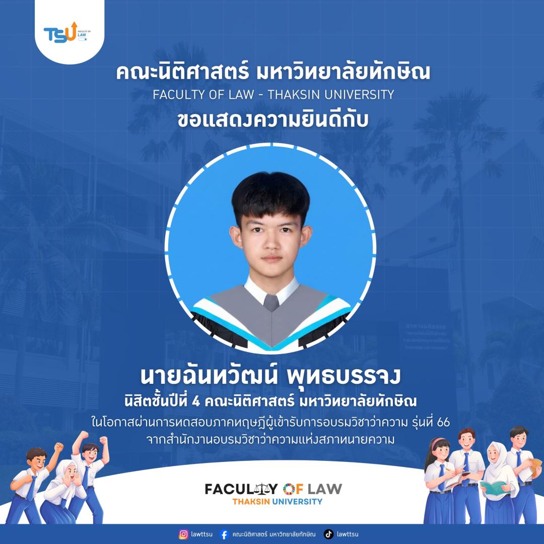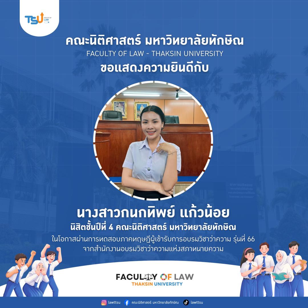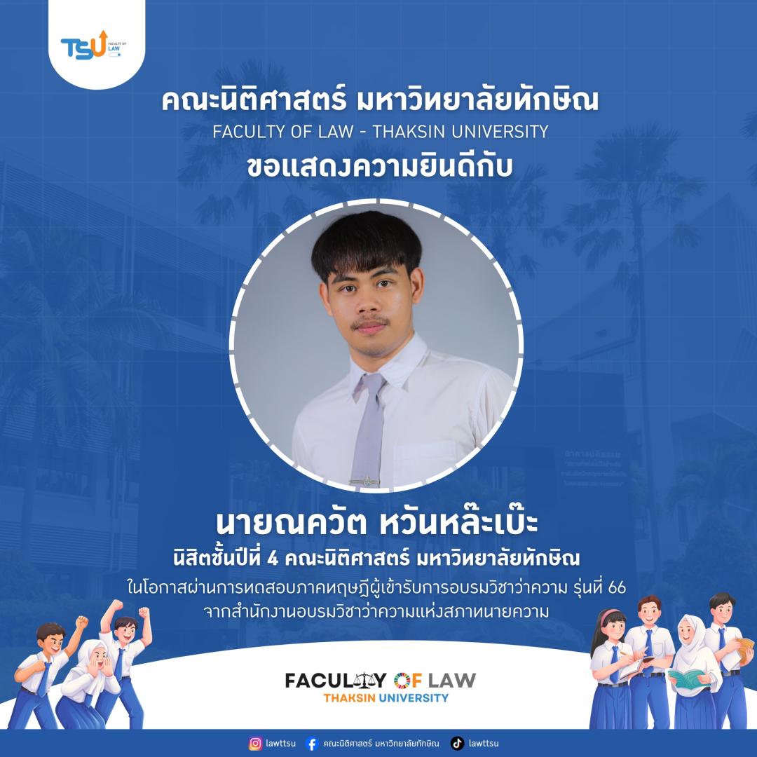 คณะนิติศาสตร์ มหาวิทยาลัยทักษิณ ขอแสดงความชื่นชมและยินดีกับ นิสิตและศิษย์เก่าคณะนิติศาสตร์ ในโอกาสสอบผ่านการทดสอบภาคทฤษฎี ผู้เข้ารับการอบรมวิชาว่าความ รุ่นที่ 66 จากสำนักงานอบรมวิชาว่าความแห่งสภาทนายความ