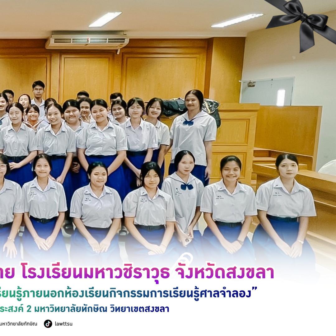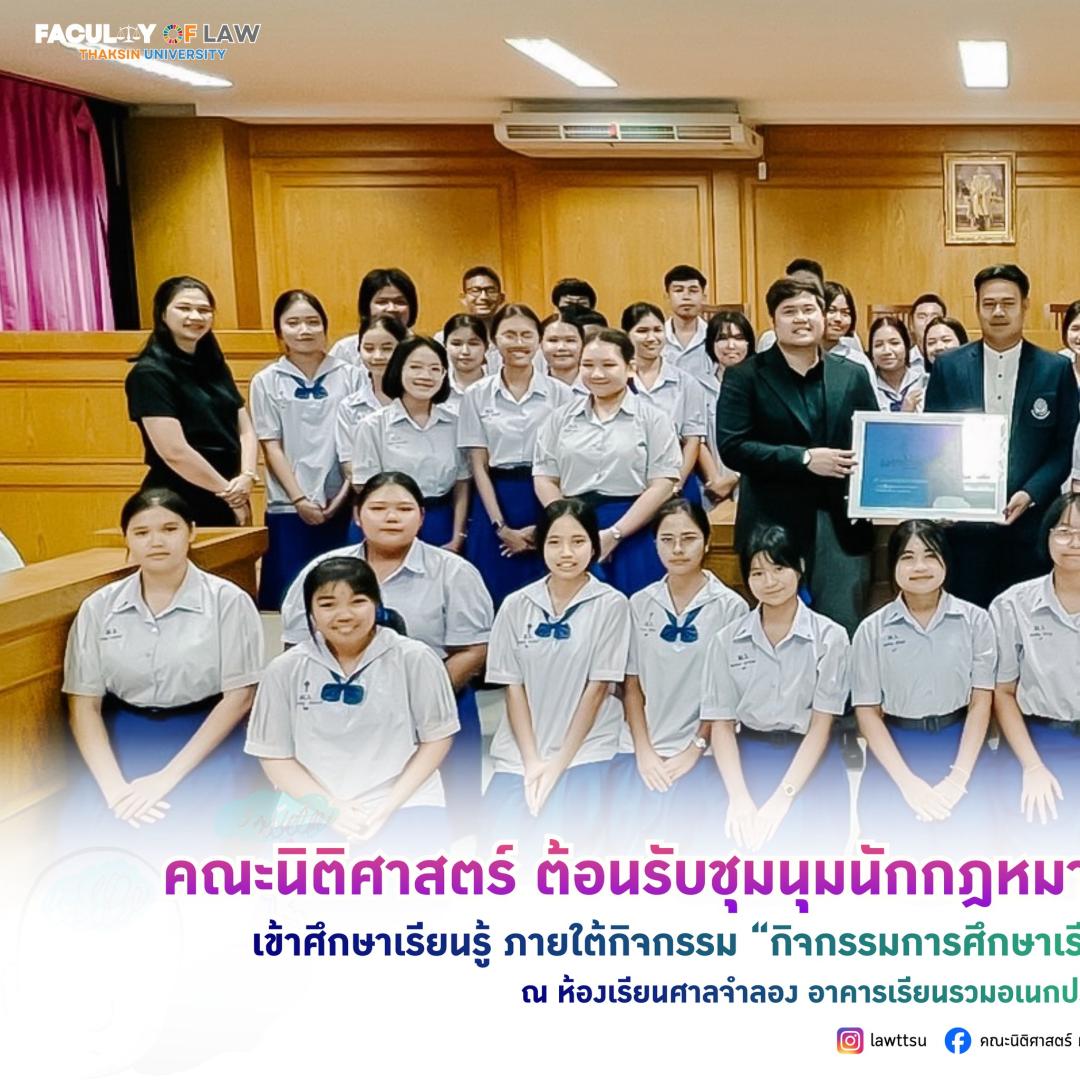 ????คณะนิติศาสตร์ มหาวิทยาลัยทักษิณ เปิดบ้านต้อนรับน้อง ๆ "ชุมนุมนักกฎหมาย" จากโรงเรียนมหาวชิราวุธ จังหวัดสงขลา เข้าศึกษาดูงานกิจกรรมการเรียนรู้ศาลจำลอง เพื่อเสริมทักษะนอกตำราและสร้างแรงบันดาลใจสู่เส้นทางนักกฎหมายในอนาคต สร้างแรงบันดาลใจ ให้น้อง ๆ มัธยมต้นและปลาย จำนวน 59 คน ร่วมเรียนรู้ผ่านสถานการณ์จำลอง พร้อมทั้งแนะนำการเข้าศึกษาต่อในระดับอุดมศึกษา และการศึกษาต่อเเบบการเรียนล่วงหน้า (Pre-degree)