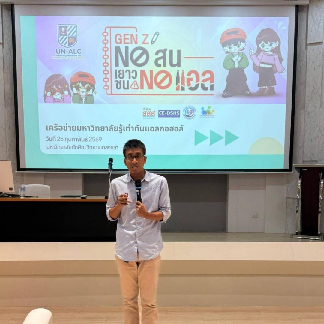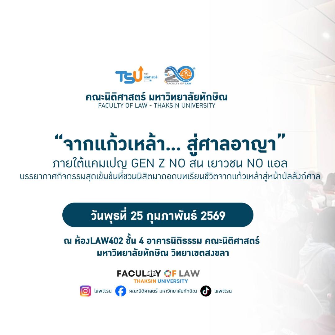 เมื่อวันพุธที่ 25 กุมภาพันธ์ 2569 ที่ผ่านมา คณะนิติศาสตร์ มหาวิทยาลัยทักษิณ ร่วมกับ สโมสรนิสิตคณะนิติศาสตร์ และ เครือข่าย UN-ALC จัดกิจกรรมสะท้อนสังคมในหัวข้อ “จากแก้วเหล้า... สู่ศาลอาญา” ภายใต้แคมเปญระดับโลก GEN Z NO สน เยาวชน NO แอล ณ ห้อง LAW 402