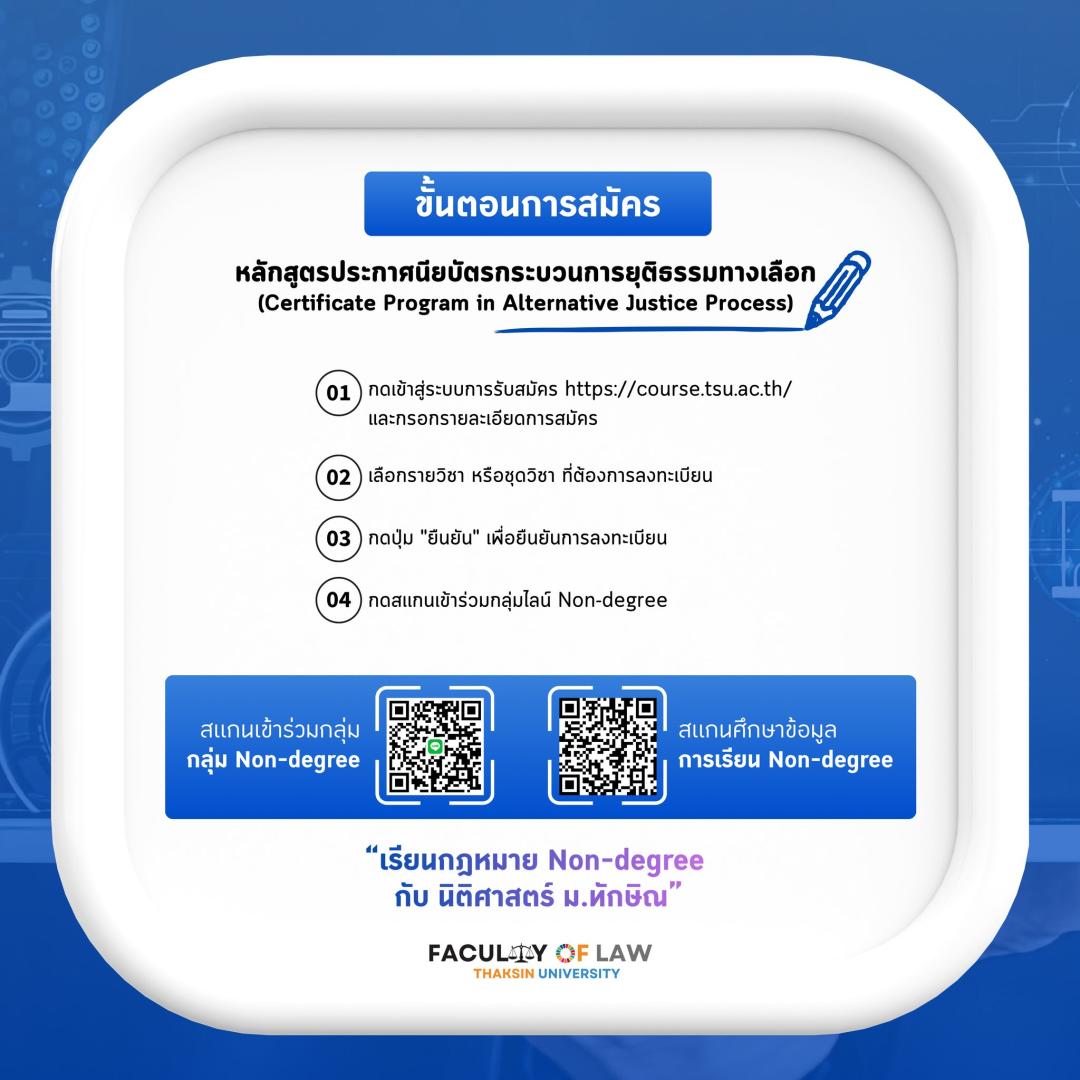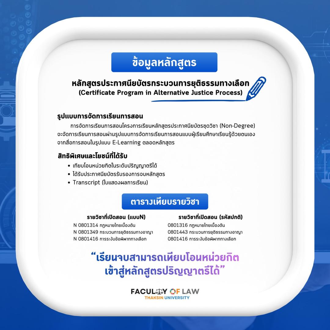????คณะนิติศาสตร์ มหาวิทยาลัยทักษิณ เปิดรับสมัครผู้ที่สนใจเข้าศึกษาในหลักสูตรประกาศนียบัตรชุดวิชา (Non-Degree) หลักสูตร "กระบวนการยุติธรรมทางเลือก" (Certificate Program in Alternative Justice Process) ซึ่งออกแบบมาเพื่อรองรับรูปแบบการเรียนรู้ยุคใหม่ผ่านสื่อการสอนแบบ E-Learning ตลอดหลักสูตร โดยผู้เรียนสามารถศึกษาเรียนรู้ได้ด้วยตนเองอย่างอิสระ