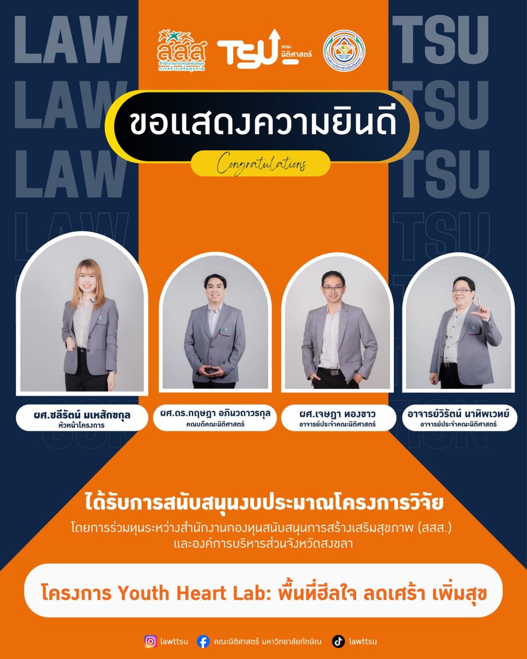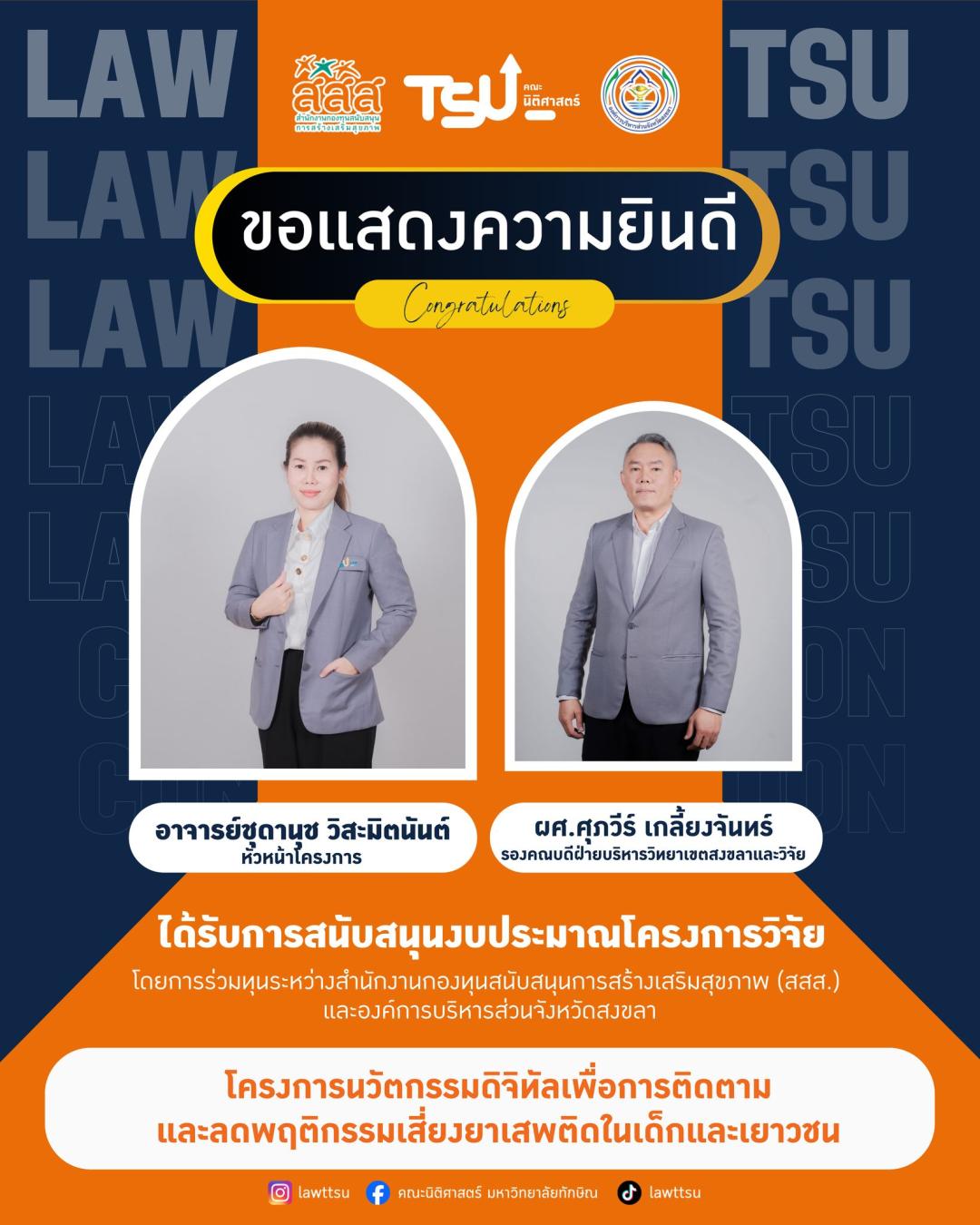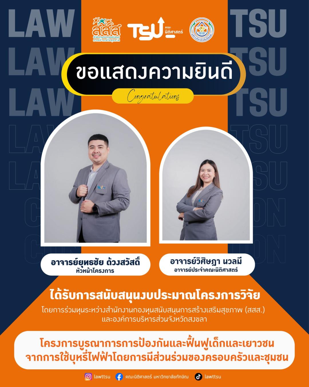 คณะนิติศาสตร์ มหาวิทยาลัยทักษิณ! ✨ ขอเเสดงความยินดีกับคณาจารย์ของเราได้รับความไว้วางใจและสนับสนุนงบประมาณวิจัยจาก แผนงานร่วมทุนสนับสนุนการสร้างสุขภาวะ (สสส. ร่วมกับ อบจ.สงขลา) เพื่อดำเนิน 4 โครงการเชิงรุกที่มุ่งแก้ปัญหาและสร้างภูมิคุ้มกันให้แก่เยาวชนในจังหวัดสงขลา