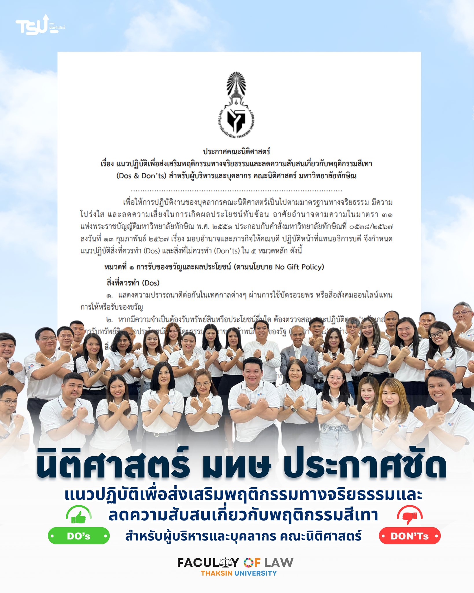 คณะนิติศาสตร์ มหาวิทยาลัยทักษิณ ประกาศนโยบาย No Gift Policy ประจำปีงบประมาณ 2569