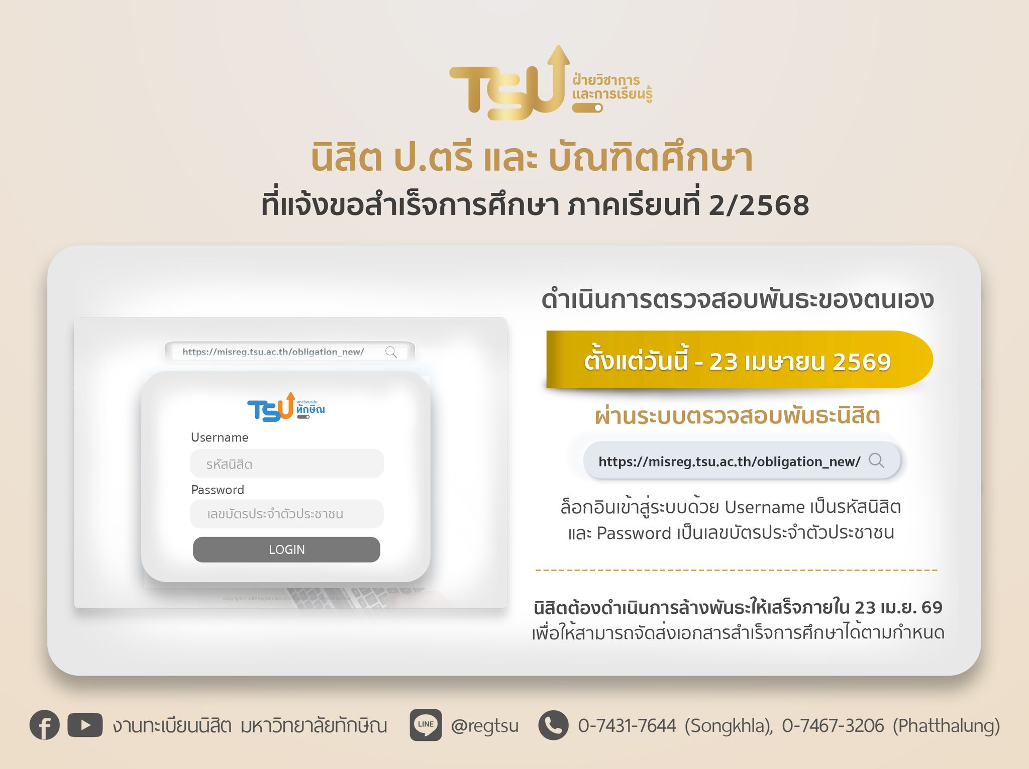 นิสิตระดับ ป.ตรี และ บัณฑิตศึกษา ที่แจ้งสำเร็จการศึกษา ภาคเรียนที่ 2 ปีการศึกษา 2568 ดำเนินการตรวจสอบพันธะนิสิต