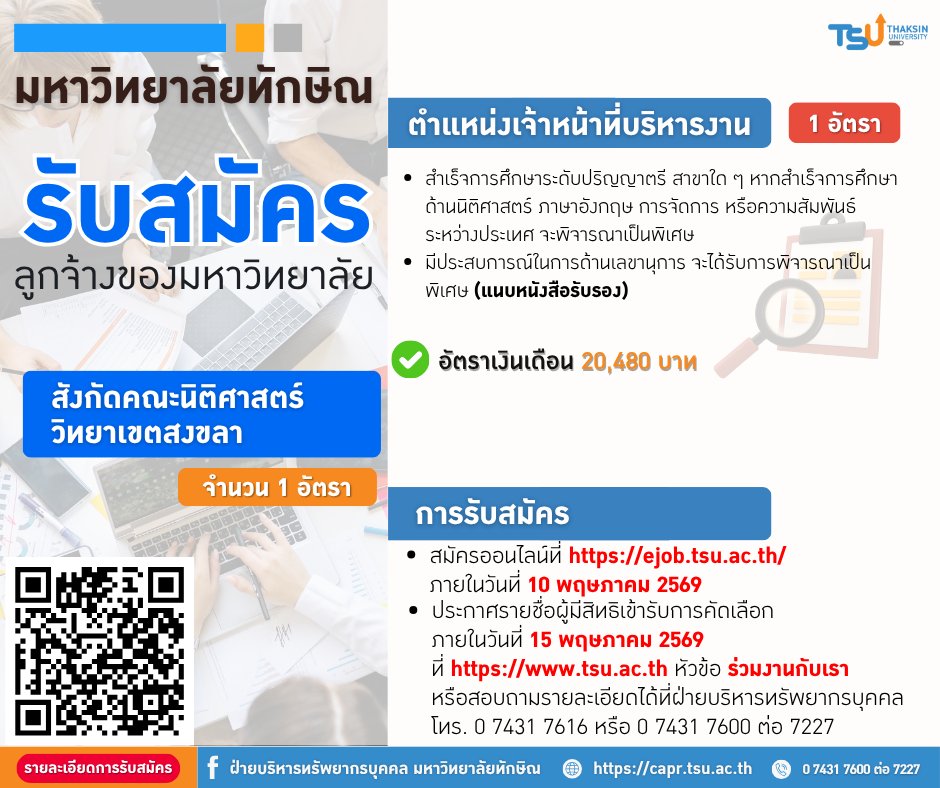 รับสมัครบุคคลเข้าสอบแข่งขันเพื่อจ้างเป็นลูกจ้างของมหาวิทยาลัย ตำแหน่งเจ้าหน้าที่บริหารงาน สังกัดคณะนิติศาสตร์ วิทยาเขตสงขลา